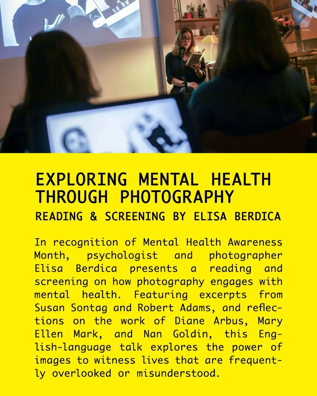As part of the OFF FOTO Festival 2025, I presented a screening and reading that looked at how photography can help us understand and talk about mental health. I read selected paragraphs from Susan Sontag and Robert Adams, and presented photographs by Mary Ellen Mark, Nan Goldin, and Diane Arbus. Together, these works invited the audience to reflect on how images and words can open new ways of seeing and connecting with others.